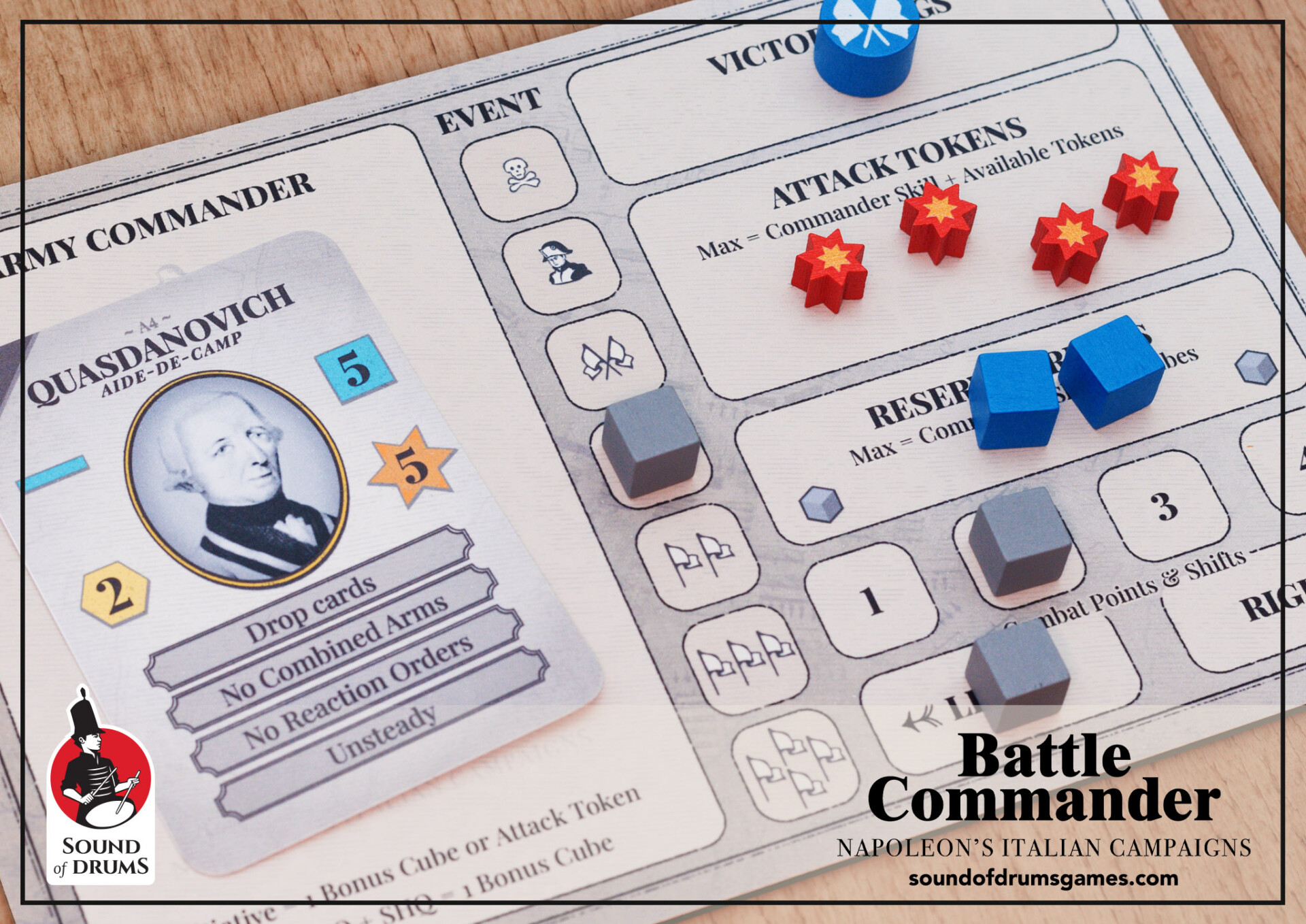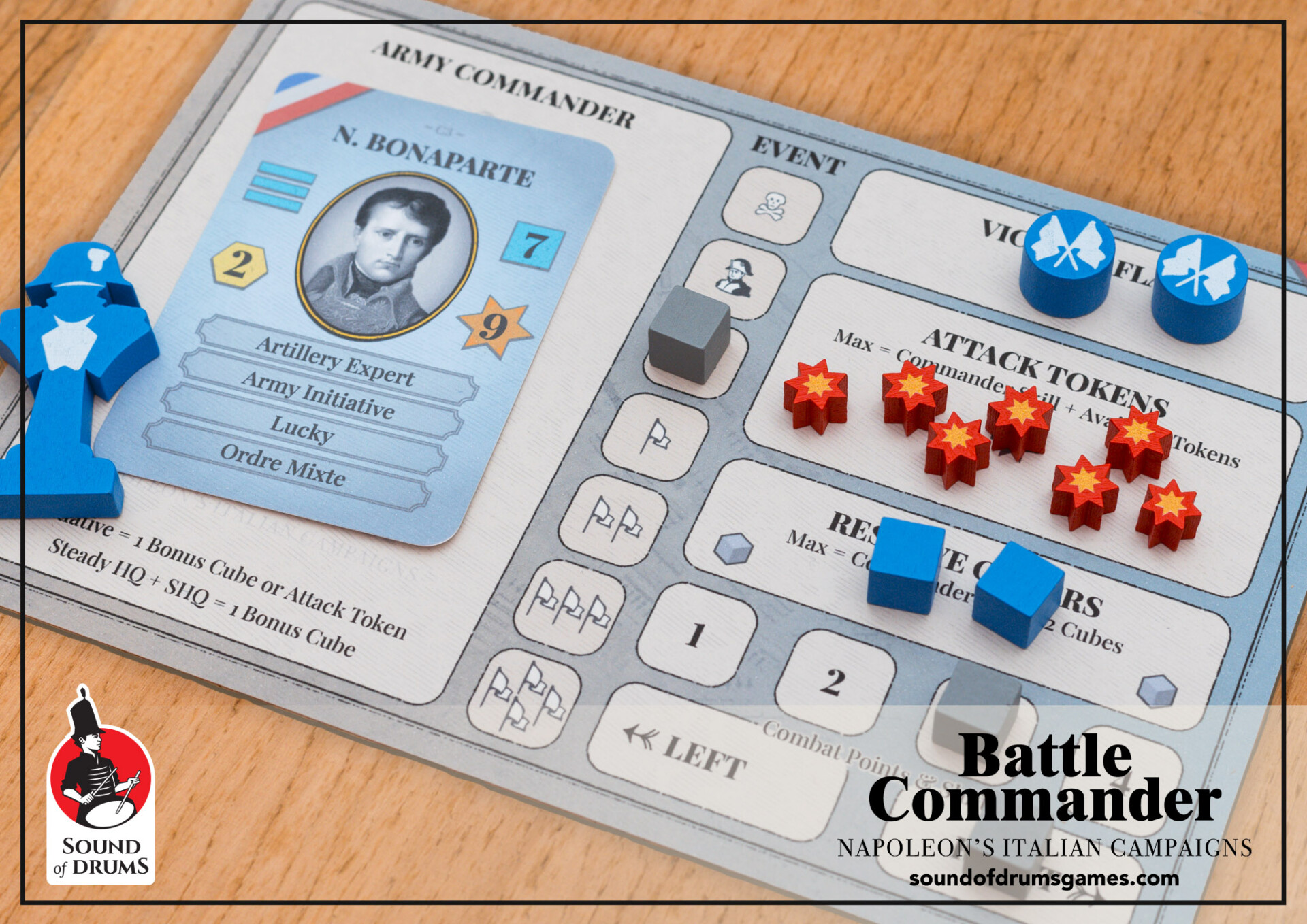 Una carta de personaje representa a cada comandante, sus habilidades específicas y los recursos de tu ejército; los importantísimos líderes subordinados se integran en un innovador sistema de cartas polivalentes. La moral y la habilidad de las tropas son una mecánica fundamental: desmoralizar al enemigo contribuye en gran medida a ganar la batalla, ya que los ejércitos van degradando lentamente su rendimiento hasta llegar al punto de ruptura. Las bajas se gestionan sin esfuerzo y se mantiene en todo momento una correcta «apariencia del campo de batalla».